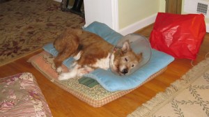 Let’s see now. Paw Licker Annie is resting on her usual bed on the floor and I see she once again has on her Helmet Hood which is used by the Peeps to keep her from licking herself to death. Yes, I recognize that poze and would have to say the Old Girl looks much the same but Slow says Annie’s not quite on her A-Game any more and seems to have lost a step or two since she last laid eyes on her. That would be Pot calling Kettle Black, if you catch my drift.