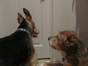 In the closet. Yep, that’s me and Paw Licker Annie after Slow shut the door in our faces and sat down in the closet with all of her cables and wires and devices around her and us looking at the door for escape. Alas, we were STUCK in the closet with Slow while the storms raged over our heads. Slow called Pretty as soon as she sat down and we heard her say the Montgomery County Emergency Peeps had called her to warn her we might have a Tornado or some bullshit like that which is why we were all crammed into the closet like a can of sardines, for God’s sake. Must’ve been quite a long time since Slow’s been in the closet. Heh, heh…my little homosexual humor for the night.