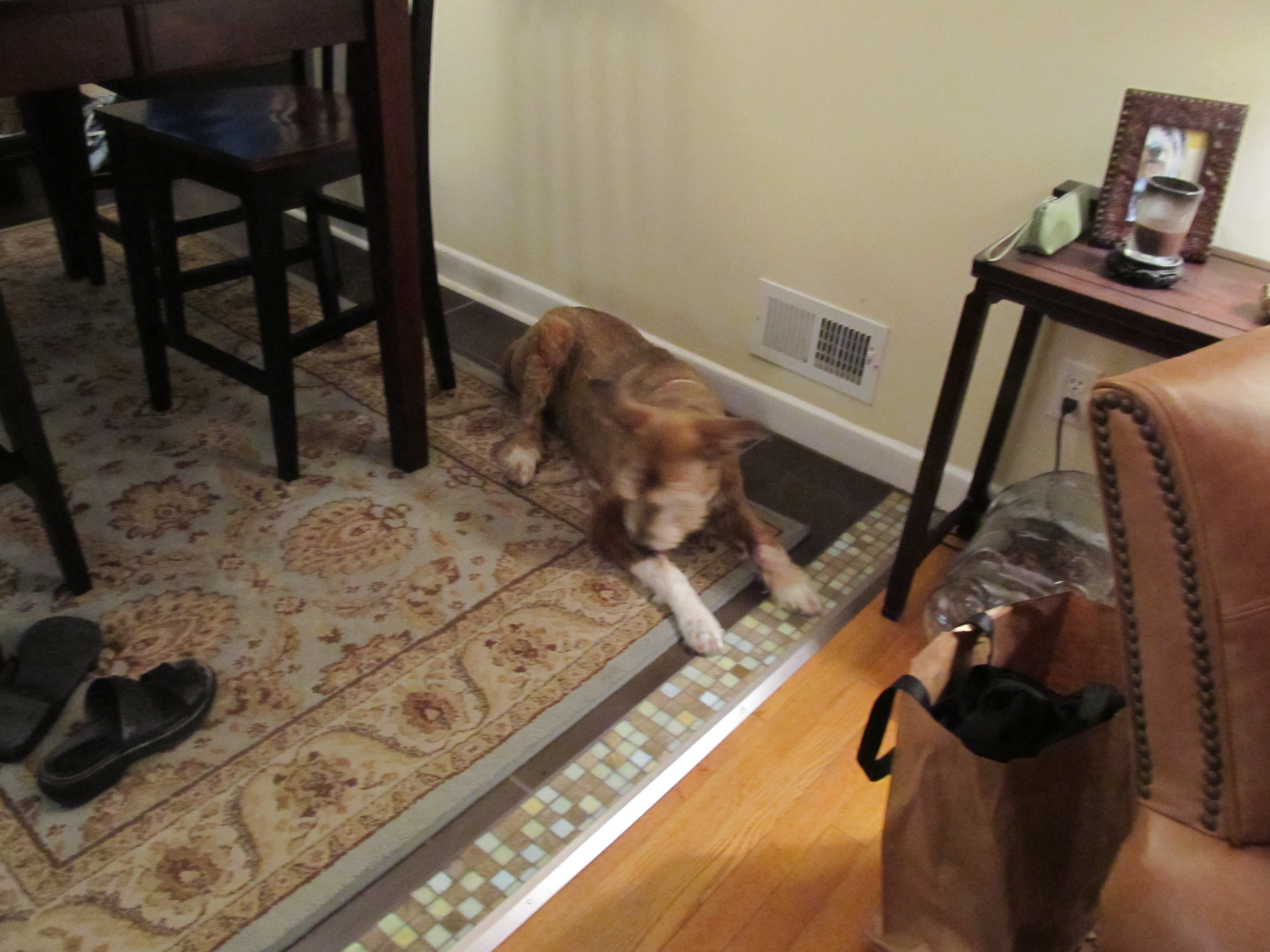 Notice the Absolut and tonic and soda and assorted other Adult Beverages including the unopened bottle of Merlot on the bottom shelf next to the water bowls. Ok. The old woman Slow NEVER shares the good stuff. Nosirree, it’s always your typical bullshit about Oh no, Red you can’t have a sip of my cocktail because alcohol KILLS dogs just like chocolate KILLS dogs. Seriously? If chocolate KILLED dogs, Tennis Ball Obsessed Chelsea would have been dead YEARS ago. She’s sneaked around and found BAGS of chocolate candy from Pretty’s General Store and eaten every bite without missing a beat. She doesn’t know the meaning of the word SHARE, either.