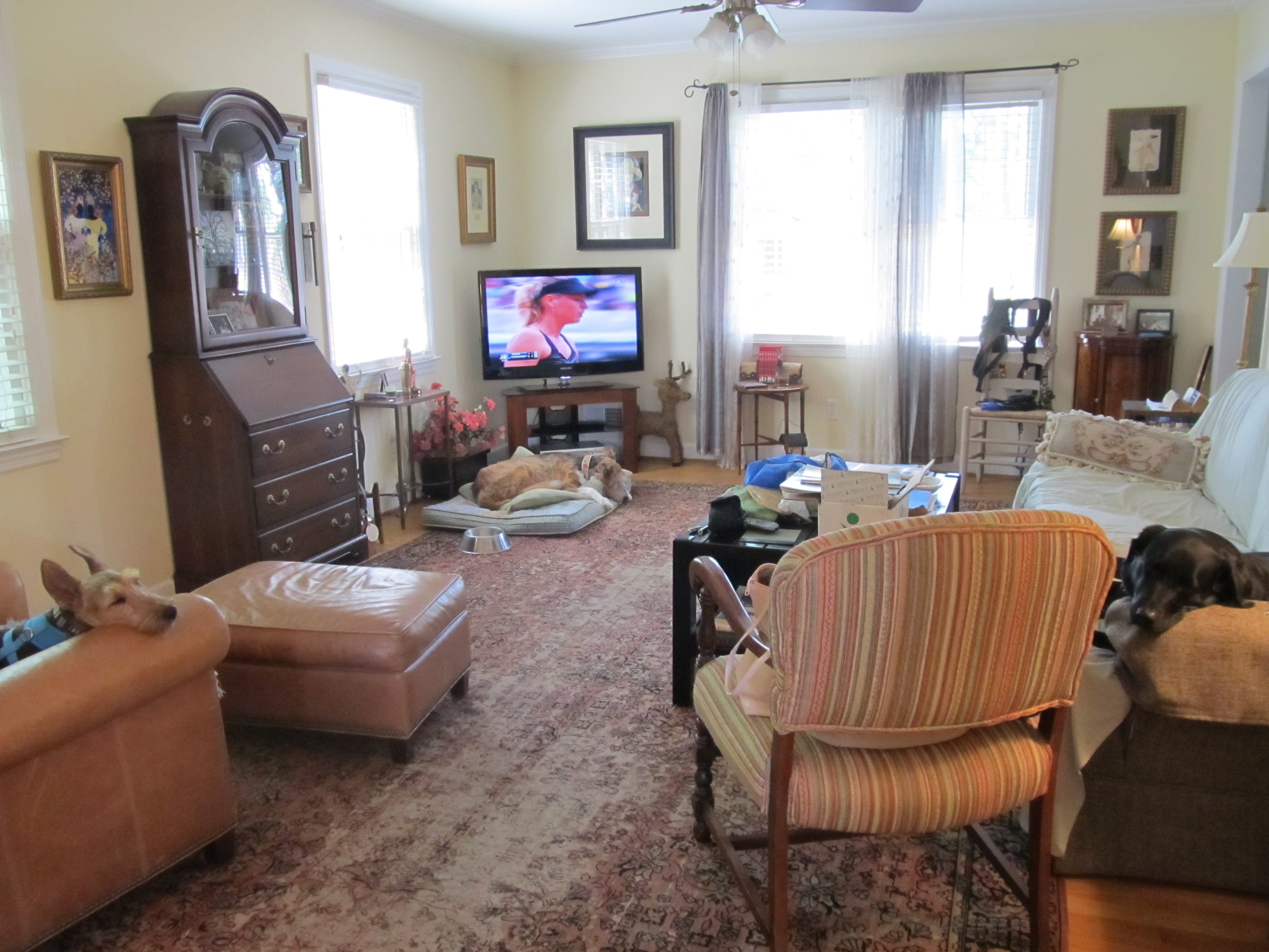 I’d say it was kinda like nobody really gives a rat’s ass except the old woman Slow. Pretty was working and while Tennis Ball Obsessed Chelsea loves a tennis BALL, she really doesn’t care for the Grand Slam Finals on TV. Paw Licker Annie was equally unimpressed. Smokey Lonesome Ollie was upstairs claiming his rightful place as King of the King-sized Bed. Spike was outside playing with his new best friend Sadie who appears to stay at our house more than she does hers. We Party.