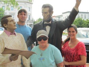Son #One and Pretty Two and me with Abe Lincoln and friend in Gettysburg