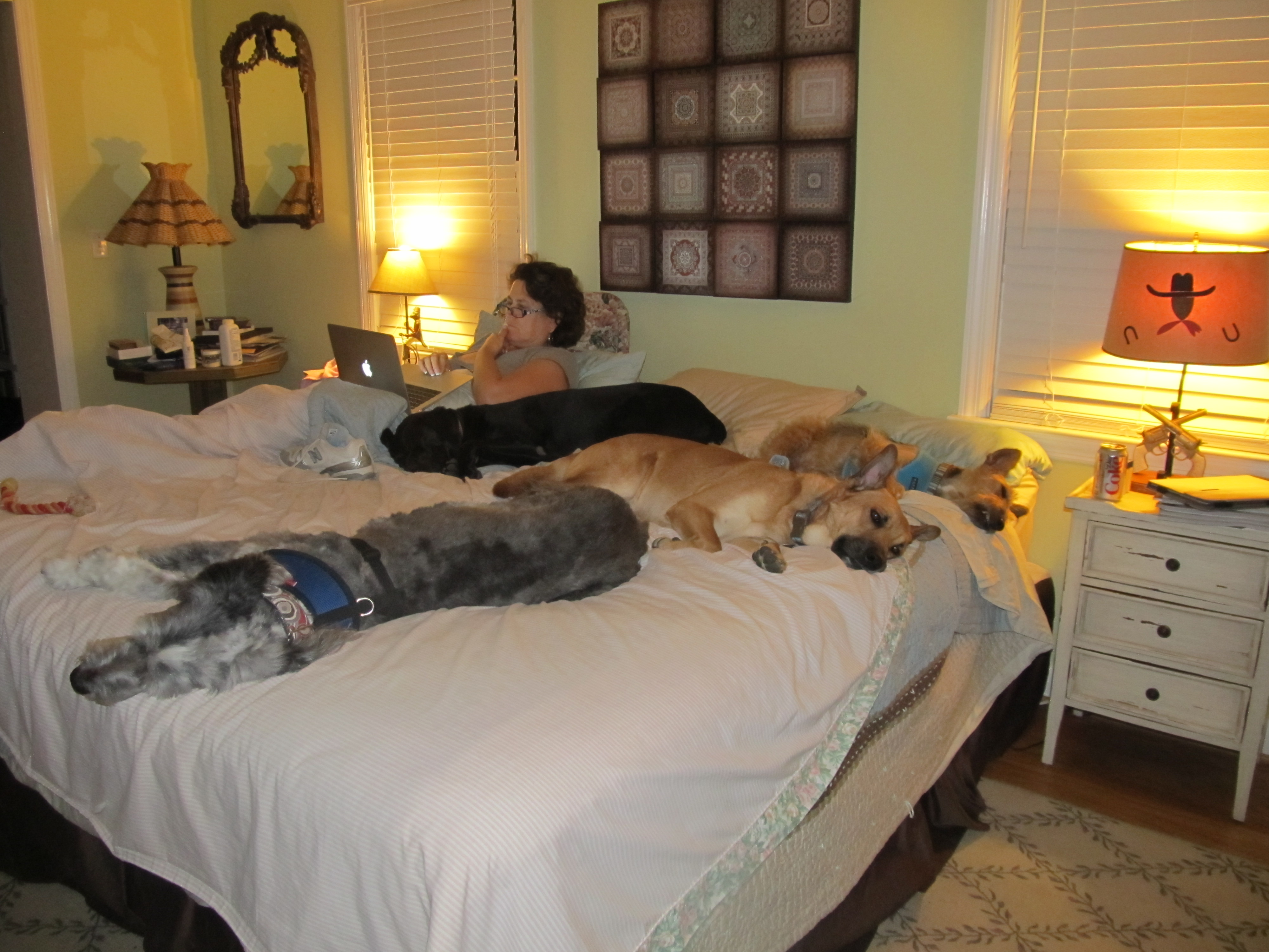And then the old woman Slow starts moving very fast up the driveway to the house and Pretty is hollering at moi as I race away from my new best friends toward Pretty’s arms and everyone is talking all at once and there’s general pandemonium at Casa de Canterbury with lots of noise because then all the other Pups are Barking and throwing themselves  against the windows like they do whenever anybody is standing on the front porch without Official Permission plus it’s late at night and you can see the lights coming on in the neighbors’ houses all around us as they try to figure out if they need to call the Police or anything like that and it’s like this Reality TV Show without the cameras.