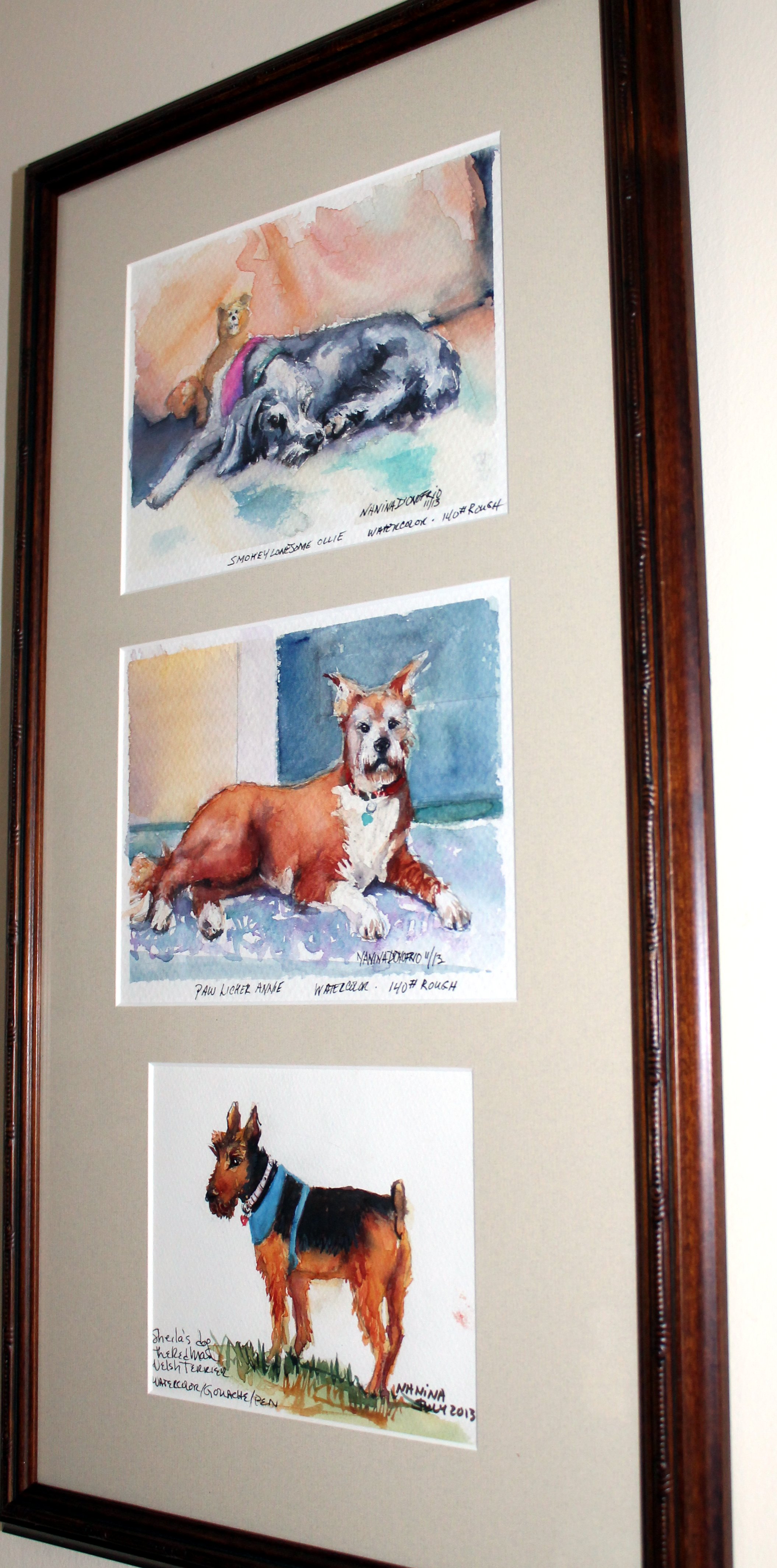 Thank you, thank you for showing us the how the portraits look all together. The framing is super awesome! Ma was a beast when she was painting Annie and Ollie, especially near the end because this was “so important for Slow and Pretty.” We had to be very, very quiet because SHE COULDN’T HEAR HERSELF THINK! I did steal one of her paint brushes, an expensive sable hair one, just to get attention. Holy Milkbones, was Ma ever hot! I dropped it after two runs around the downstairs.