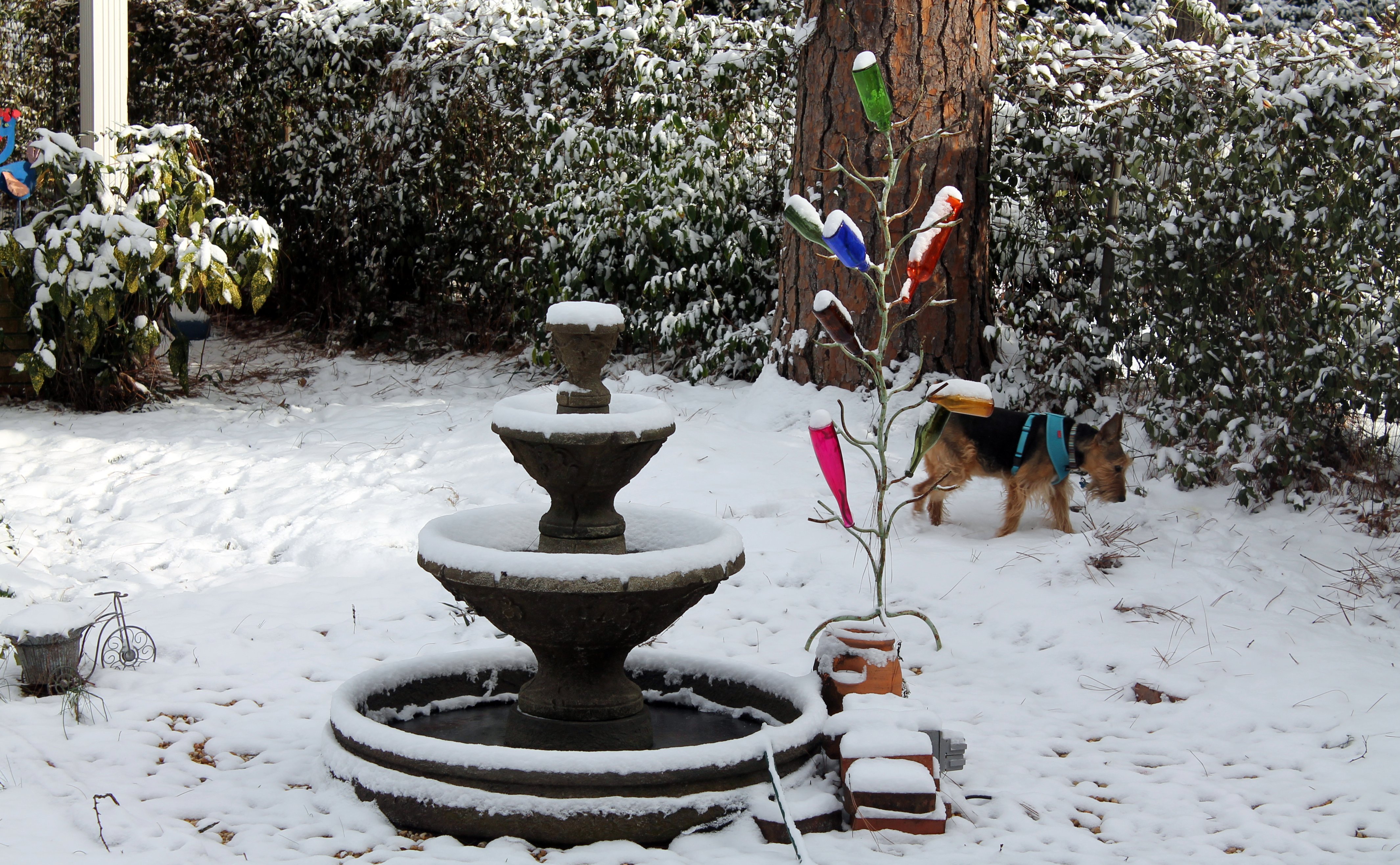 Yes, the bottle tree has a few more colorful bottles thanks to Pretty who is not happy with the placement of the tree next to the water feature.